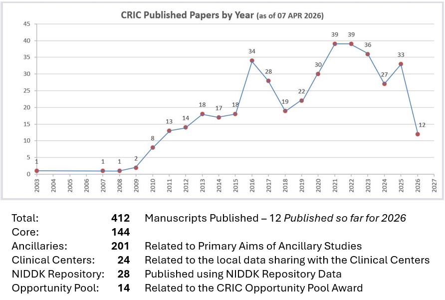 The CRIC Study Investigators have published research results using data from the CRIC Study and CRIC ancillary studies in numerous peer-reviewed medical journals including subspecialty journals in nephrology, cardiology, hypertension, geriatrics, and diabetes as well as general medical journals. Abstracts and/or full text manuscripts can be accessed through PubMed [PMID], PubMed Central [PMC], and "Free Access" online repositories available via the links at the end of each entry. A listing of the full CRIC Publications Library is available here in Excel.